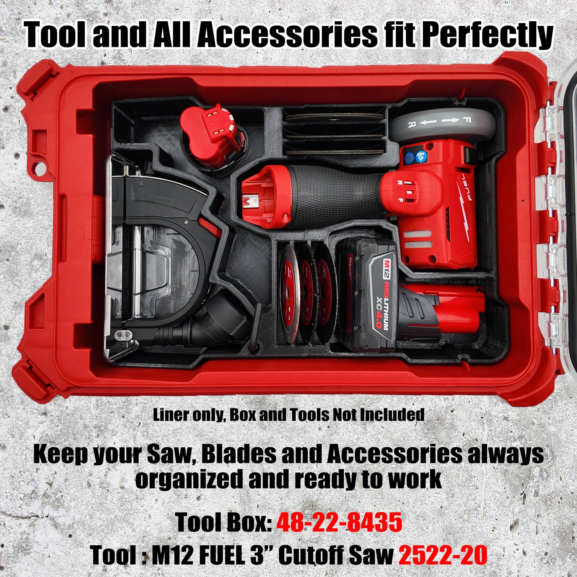 🔧 PRECISION FIT & SMART LAYOUT – Designed specifically for the Milwaukee M12 3" Cut-Off Tool #2522, this custom black plastic liner securely holds the tool with a battery installed, plus two additional batteries. Engineered to drop perfectly into the Milwaukee Packout Compact Organizer (48-22-8435) for a clean, professional setup.