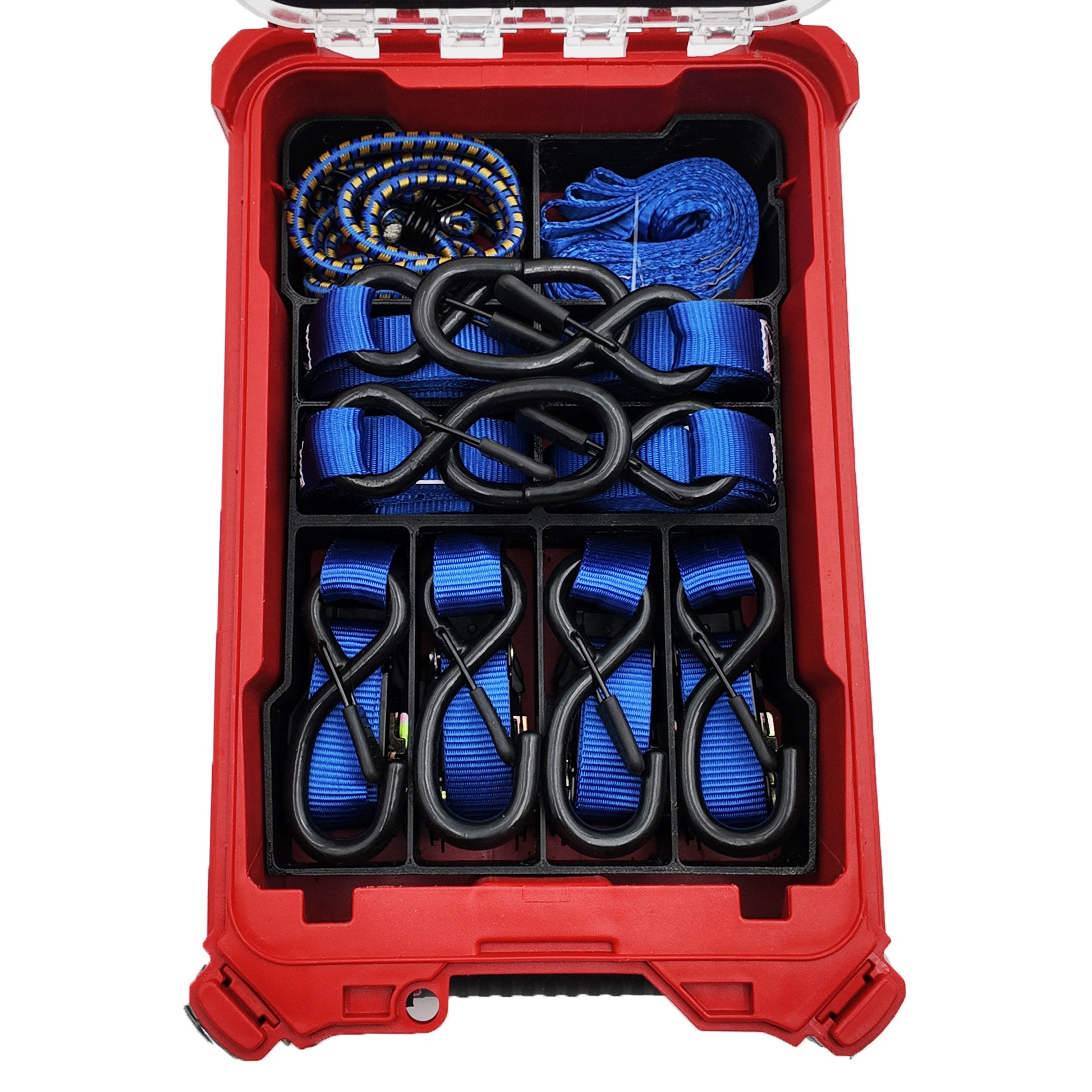- 🤯 END THE RATCHET MESS: Custom-designed storage solution fits perfectly inside the deeper Milwaukee PACKOUT 5-Compartment Compact Organizer (48-22-8435). Instantly organize up to FOUR full ratchet strap sets, soft loops, and bungee cords in one convenient, portable case. (Case NOT Included)